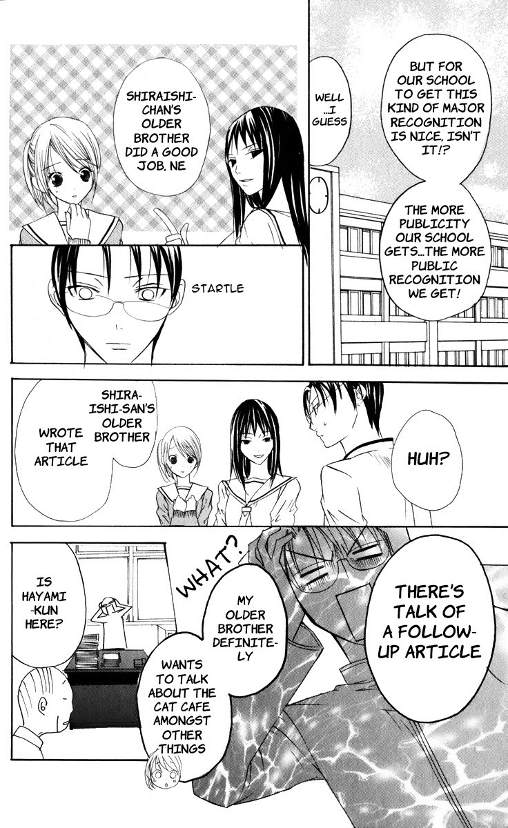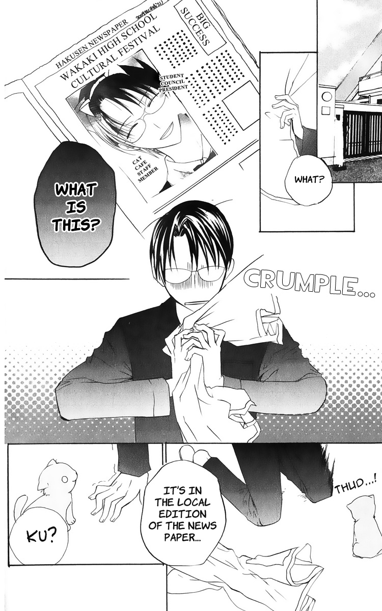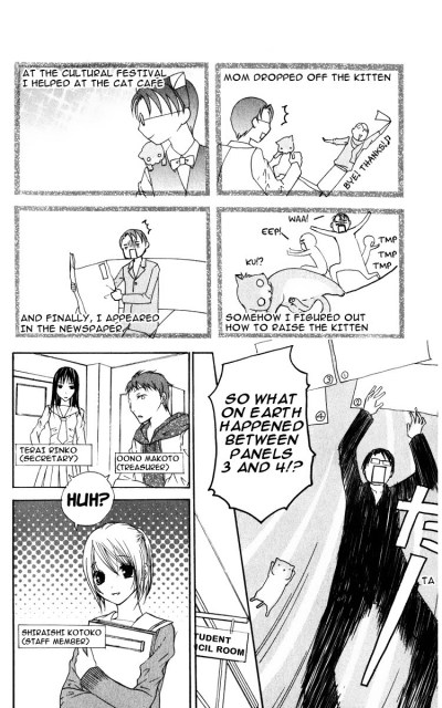 I scanned the second chapter from a “Animal Special” comic book that came with an issue of either “Hana to Yume” or “BetsuHana,” but I translated it from the tankoubon. As I edit the manga, I’ve noticed that the two are slightly different…eh-heh-heh…oh well. I prefer the tankouban version because it’s more decorated than the “Animal Special” version…sigh. Why did this happen? Well, the tankouban was nearly impossible to scan without dissecting the book. Oh well…here’s a preview of what’s coming up next in “Kaichou-san no Koneko:”