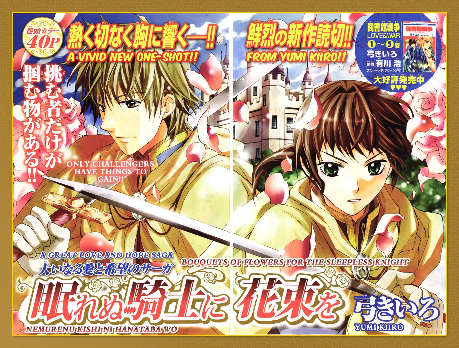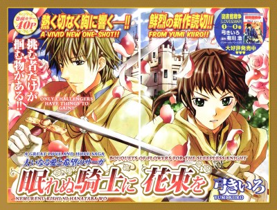 Here is the one-shot “Nemurenu Kishi ni Hanataba wo” (“Bouquets of Flowers for the Sleepless Knight”). This story and the characters seem very inline with Yumi Kiiro’s current series “Library Wars: Love and War.” Both characters are strong and likable and the story is a good mix of humor, romance and adventure. I hope you enjoy this short story as much as I did. Oh! and a big thank to our new cleaner, Sae, who helped get this out sooner than I expected.