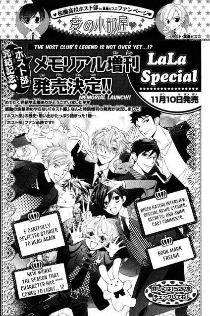 @Seida_Light — I don't understand what's going on either. I gather, though, there won't be much if any new comic material. Rather it sounds to me like there will be a bunch of prose and lists (maybe a list of the chapters or the omakes that Hatori feels are must reads). My general feeling, though, is that it's another opportunity to sell merchandise and volumes of Ouran (I hate to be cynical — but that's what this whole final party campaign felt like to me — very Kyouya-like). I think the real thing to look forward to in terms of new material is volume 18.