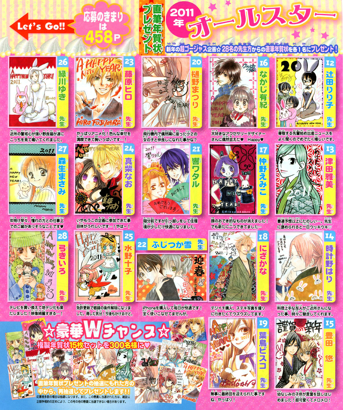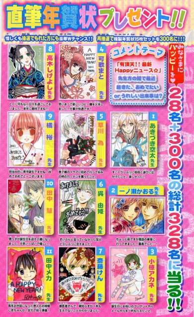 Here are some New Year’s messages from some of the artist featured in Lala and Lala DX magazine.  I didn’t have time to translate the messages and I don’t know if I will find time soon.   Anyhow, if you can’t read Japanese, then look at the pretty pictures and imagine that each one of them says “Happy New Year” + “Let’s do our best in the New Year”, because that pretty much sums them up (although a few are a little more personal and describe a major event for them in the 2010.)