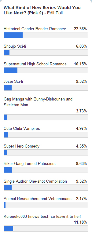 Here are the results from the new series poll I ran last week. I will announce the new series tomorrow. As a hint, because I cannot gain support from key members of the group, we will not be doing the historical gender-bender romance at this time. We will, though do the Shoujo Sci-fi series, The Biker turned pastry chef series, the super natural high school romance (only 3 chapters), and the Gag Manga. My thoughts in choosing these series were:
